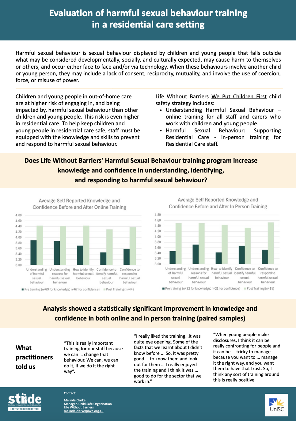 This project aims to evaluate the outcomes of Life Without Barriers’ Understanding Harmful Sexual Behaviour education program in a residential care setting. The program’s goals are to increase understanding of, and capacity to identify and respond appropriately to, harmful sexual behaviour among children and young people in out-of-home-care.