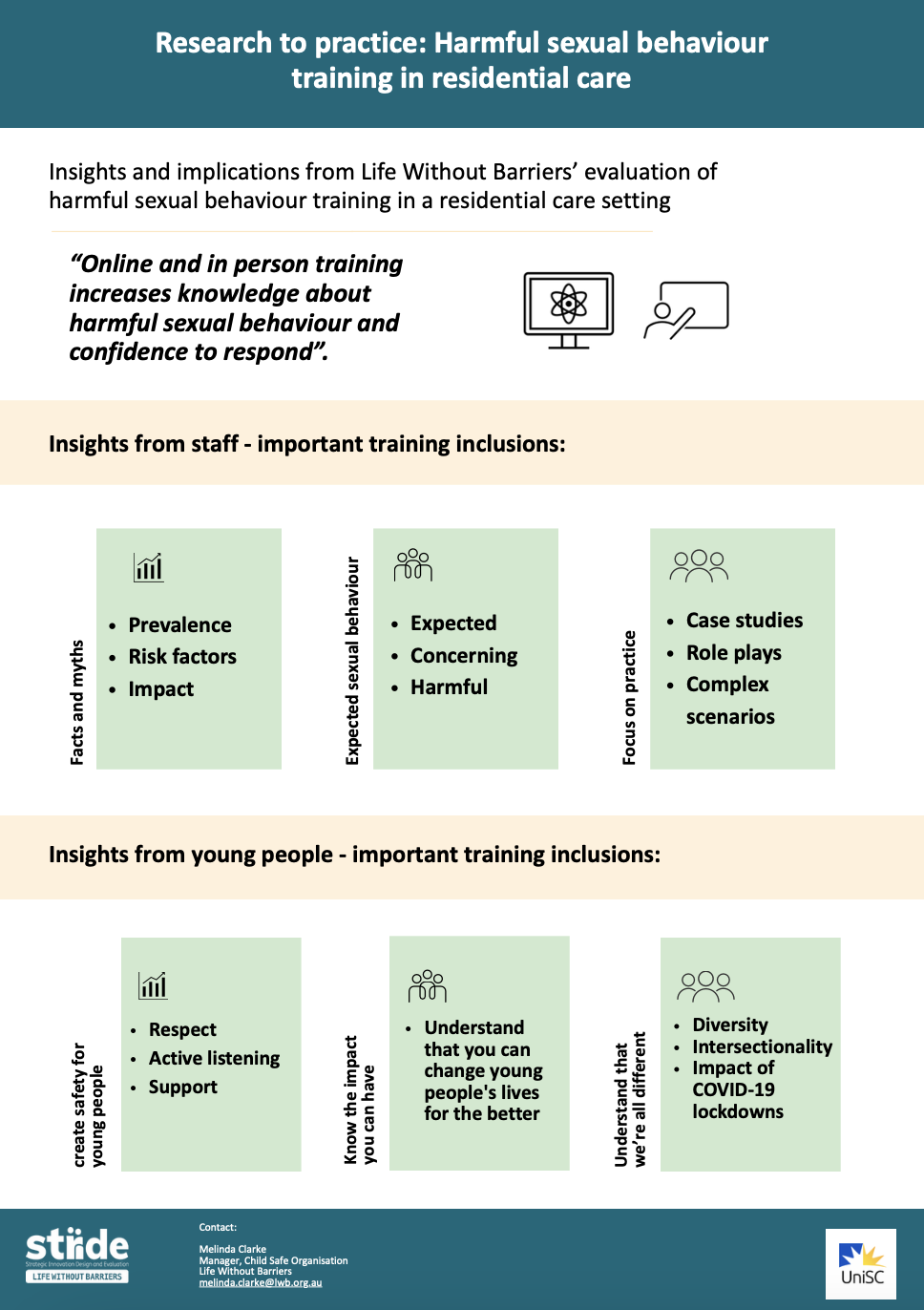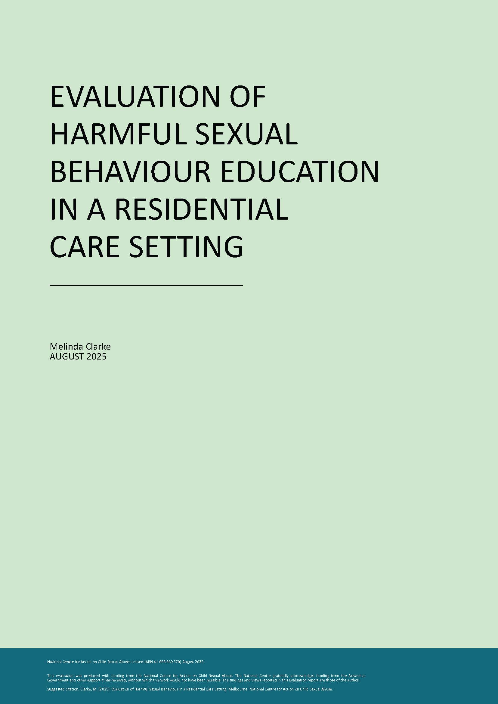 Young people in residential care are at higher risk of engaging in, and being impacted by, harmful sexual behaviour than the broader population. The capability of individuals and organisations to prevent and respond appropriately to harmful sexual behaviour is crucial to preventing and mitigating further trauma to children and young people in residential care.