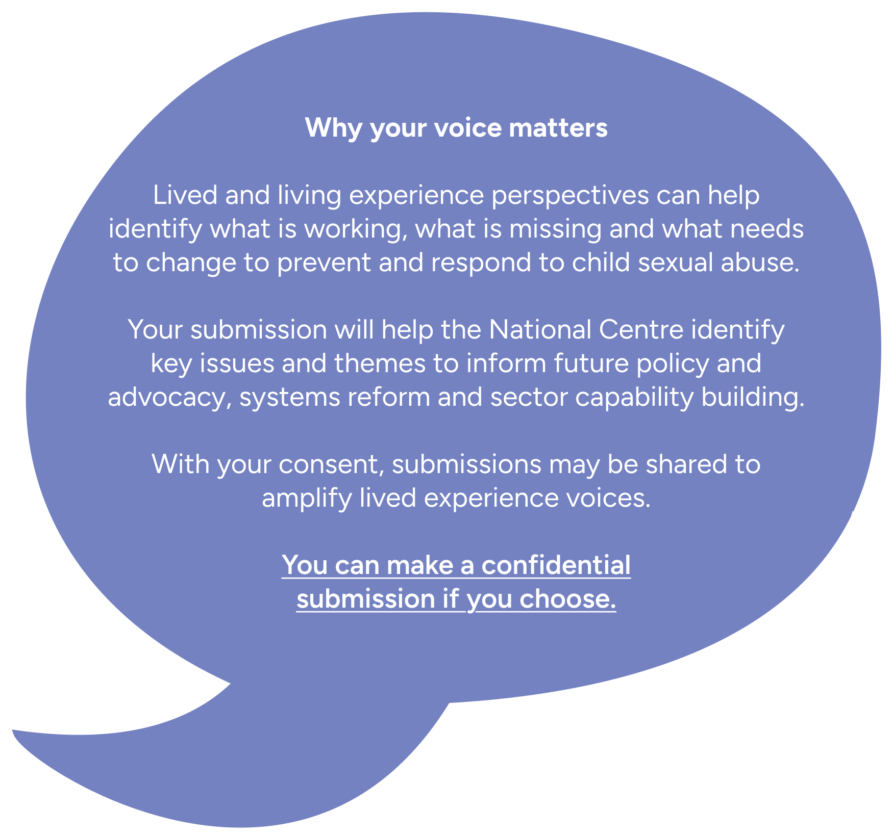 The National Centre will review all submissions to identify key issues and themes to better understand what changes victims and survivors believe are needed. Your voice will help inform future policy and advocacy, systems reform and sector capability building.